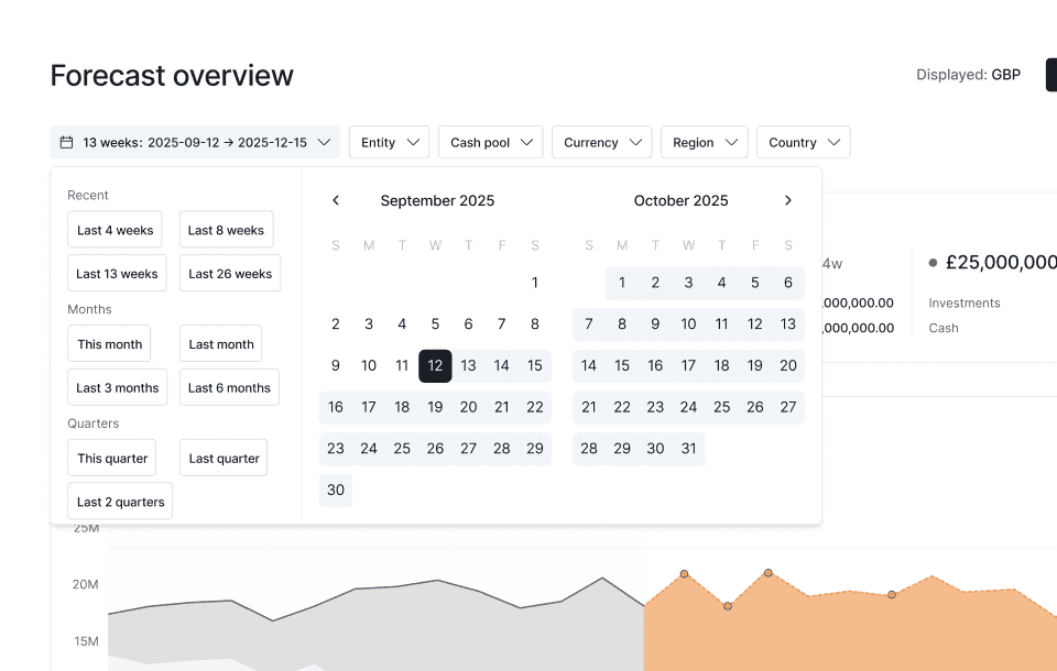Palm generates and refreshes rolling forecasts automatically: daily or weekly, on your schedule. As actuals come in, the forecast recalibrates. Choose daily granularity for short-term liquidity, weekly for your 13-week horizon, or monthly for longer-term views. Run multiple horizons simultaneously.