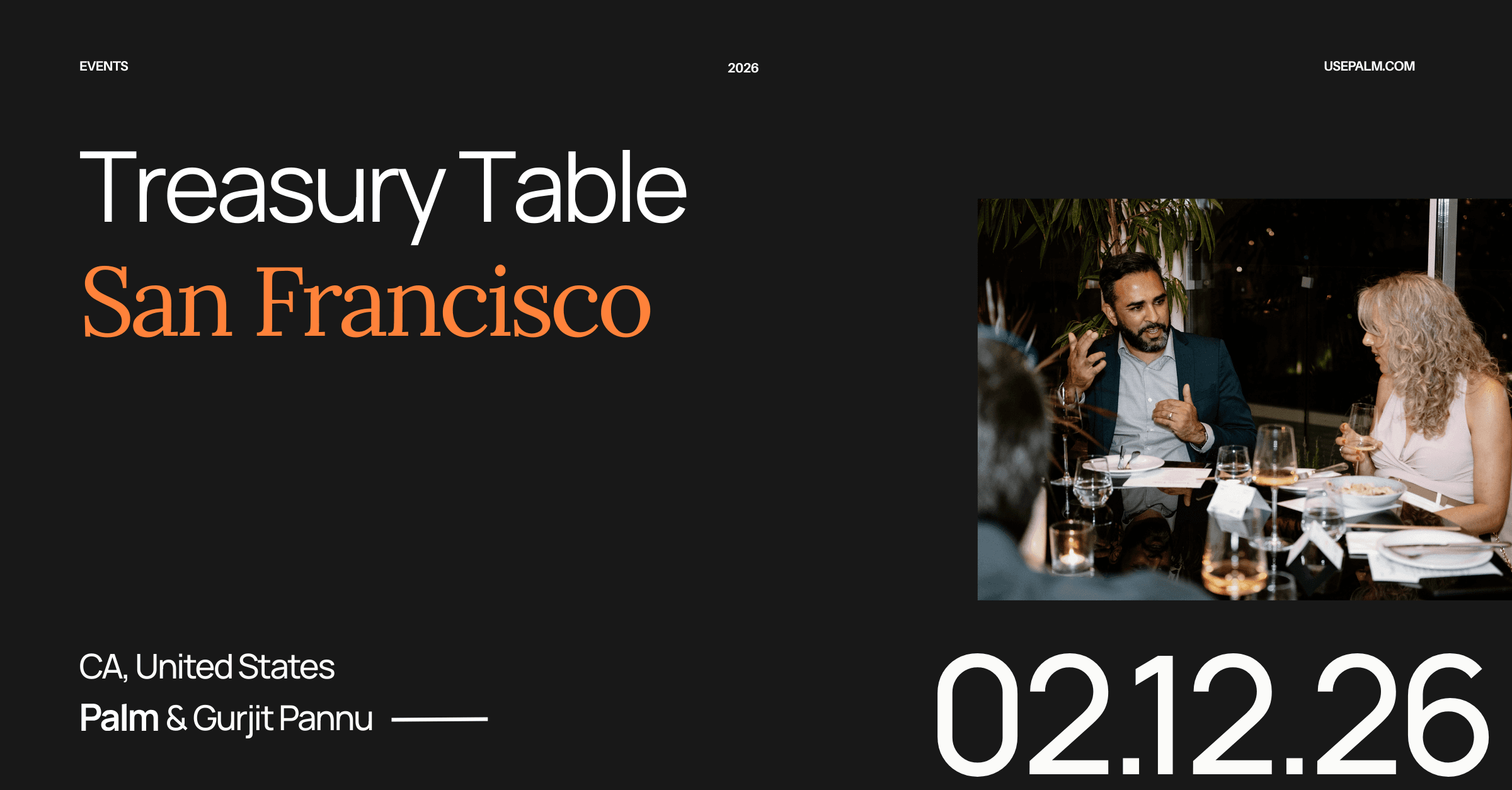 The Treasury Table dinner series is coming to San Francisco, CA on February 12! This event will be hosted by Palm Co-founder Gurjit Pannu, former treasury at Uber and Levis.